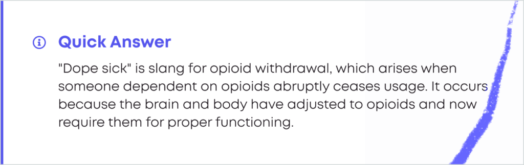 Dope sick is slang for opioid withdrawal, which occurs after a person has become dependent on opioids and then suddenly stops taking them. Dope sickness happens because the brain and body has adapted to the presence of opioids and now needs them to function properly.