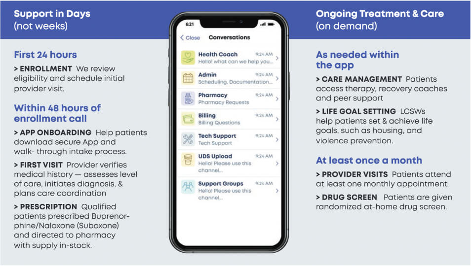 Bicycle Health employs all of its doctors, physician assistants, nurse practitioners, and therapists as full-time employees, rather than outsourcing care to contracted providers. Through a HIPAA-secure app, patients are able to speak directly with their medical provider, therapist, or clinical support specialist in one-on-one chats and therapy sessions. Patients can also leverage Bicycle Health’s virtual care platform to attend group support sessions with other individuals receiving OUD treatment.