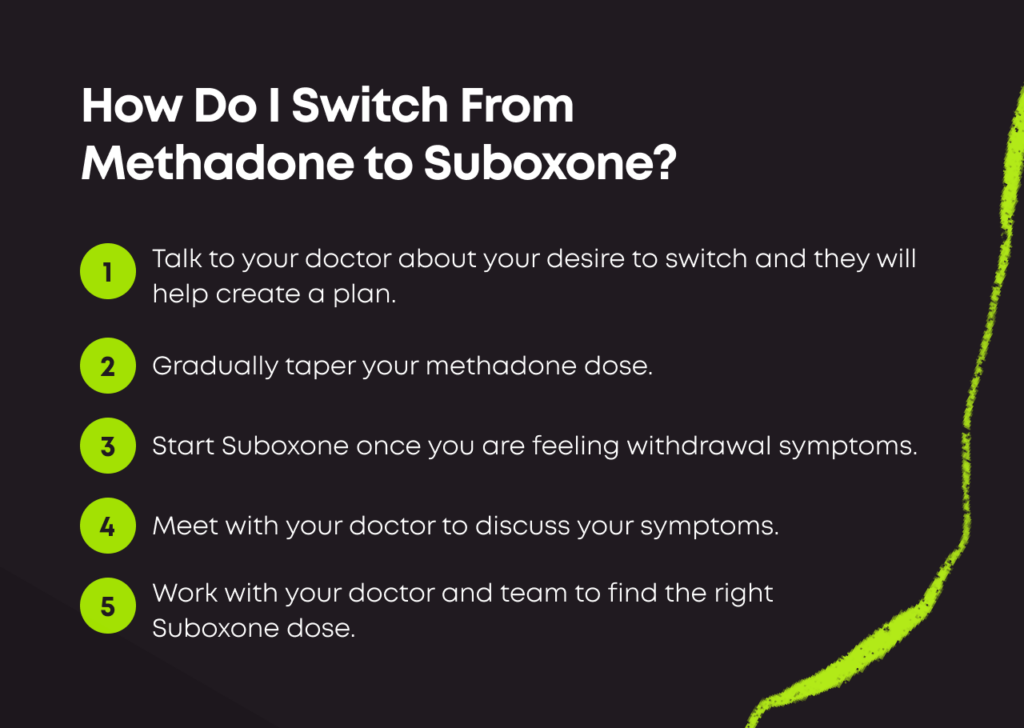 When switching from methadone to Suboxone, you should ideally wait at least 24 hours after your last methadone dose before beginning Suboxone treatment. Your Suboxone doctor will recommend a starting dose and timeline according to your specific situation.