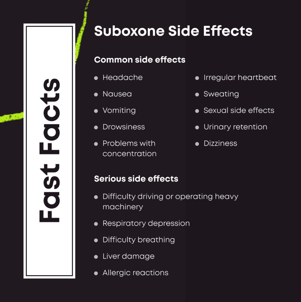What are the side effects of using Suboxone? Common side effects associated with Suboxone include headaches, nausea, vomiting, excessive sweating, constipation, insomnia, pain, and swelling in the hands and feet.