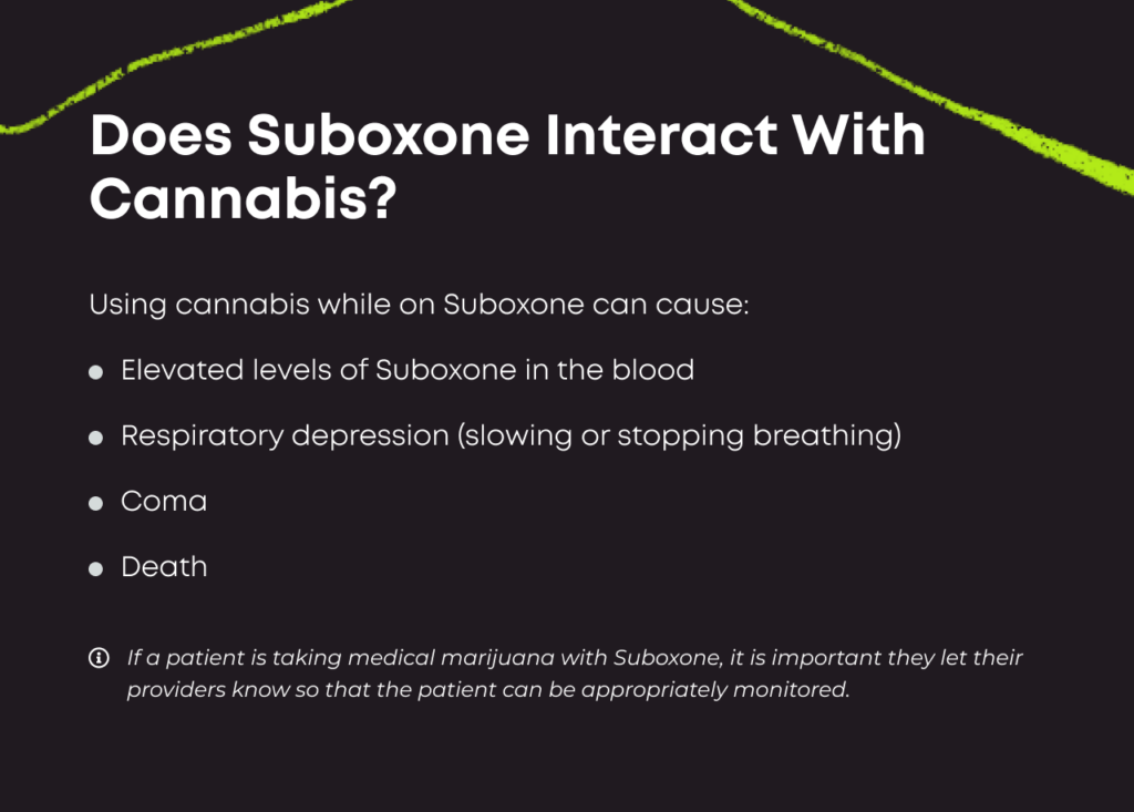 Suboxone can interact with cannabis. Both of these medications are psychoactive substances, and can potentiate each other.